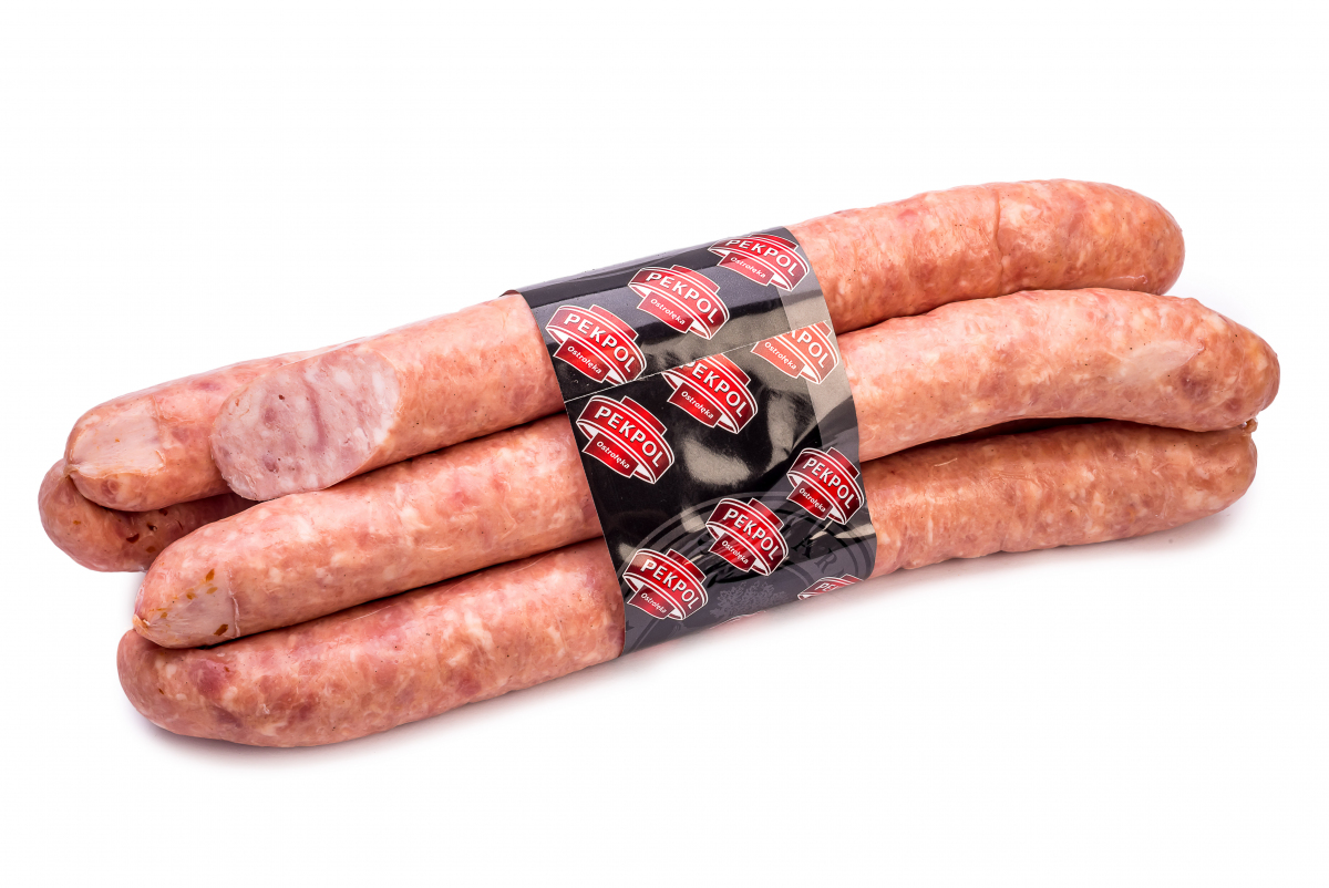KIEŁBASA WIEPRZOWO - DROBIOWA ŚREDNIO ROZDROBNIONA PARZONA, PIECZONA.100 G PRODUKTU WYPRODUKOWANO ZE 90,9 G MIĘSA WIEPRZOWEGO I 10,1 G MIĘSA DROBIOWEGO Z KURCZĄT.SKŁADNIKI: MIĘSO WIEPRZOWE, MIĘSO DROBIOWE Z KURCZĄT, WODA, SÓL, REGULATORY KWASOWOŚCI: E261, E326; PRZYPRAWY I ICH EKSTRAKTY, MALTODEKSTRYNA, GLUKOZA, WZMACNIACZE SMAKU: E621, E635; EKSTRAKT DROŻDŻOWY, OLEJ ROŚLINNY, PRZECIWUTLENIACZ E301, SUBSTANCJA KONSERWUJĄCA E250. OSŁONKA JADALNA - JELITO WIEPRZOWE.MOŻE ZAWIERAĆ: MLEKO ŁĄCZNIE Z LAKTOZĄ, GLUTEN, GORCZYCĘ, JAJA, SELER, SOJĘ.WARTOŚĆ ODŻYWCZA PRODUKTU W 100 G: WARTOŚĆ ENERGETYCZNA 1153 KJ/ 278 KCAL, TŁUSZCZ 23 G, W TYM KWASY TŁUSZCZOWE NASYCONE 9,3 G, WĘGLOWODANY 1,0 G, W TYM CUKRY 0,6 G, BIAŁKO 17 G, SÓL 2,0 G.PAKOWANO W ATMOSFERZE OCHRONNEJ.WIESIA'S SAUSAGEPORK - POULTRY SAUSAGE, COARSE GROUND, STEAMED, ROASTED.100G OF SAUSAGE FROM THE VILLAGE IS PRODUCED FROM 90,9G OF PORK AND 10,1G OF POULTRY MEAT FROM CHICKEN. INGREDIENTS: PORK, POULTRY MEAT FROM CHICKEN, WATER, SALT, STABILIZERS: E325, E262, SPICES AND THEIR EXTRACTS, MALTODEXTRIN, GLUCOSE, FLAVOUR ENHANCERS: E621, E635, YEAST EXTRACT, VEGETABLE OIL, ANTIOXIDANT E301, PRESERVATIVE E250. EDIBLE CASING – PORK INTESTINE. MAY CONTAIN: MILK (INCLUDING LACTOSE), GLUTEN, MUSTARD, EGGS, CELERY, SOY.NUTRITIONAL VALUES OF 100G PRODUCT: ENERGY VALUE 1153KJ /278KCAL FAT 23G OF WHICH SATURATES 9,3G CARBOHYDRATE 1,0G OF WHICH SUGARS 0,6G PROTEIN 17G SALT 2,0G. PACKAGED IN A PROTECTIVE ATMOSPHERE.