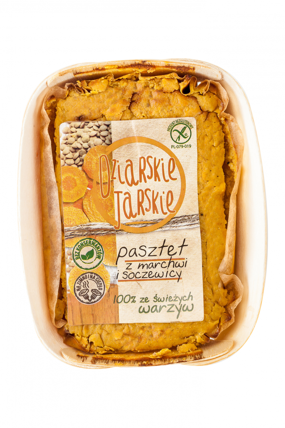 WYRÓB WARZYWNY, PIECZONY. SKŁADNIKI: MARCHEW - 40,3%, WODA, SOCZEWICA - 16,7%, CEBULA, CIECIORKA, OLEJ RZEPAKOWY, PRZYPRAWY, SÓL. MOŻE ZAWIERAĆ: GORCZYCĘ, SELER, SOJĘ. WARTOŚĆ ODŻYWCZA PRODUKTU W 100 G: WARTOŚĆ ENERGETYCZNA 631 KJ/ 151 KCAL, TŁUSZCZ 6,5 G, W TYM KWASY TŁUSZCZOWE NASYCONE 1,4 G, WĘGLOWODANY 14 G, W TYM CUKRY 1,2 G, BIAŁKO 8,6 G, SÓL 0,93 G. PAKOWANO W ATMOSFERZE OCHRONNEJ.PO OTWARCIU PRZECHOWYWAĆ W WARUNKACHCHŁODNICZYCH, NIE DŁUŻEJ NIŻ 48 GODZIN. PRODUKT BEZGLUTENOWY.Parameter