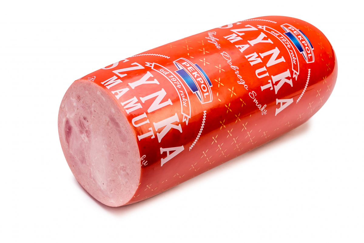 SZYNKA WIEPRZOWA WYSOKOWYDAJNA, Z DODATKIEM WODY, PARZONA, Z POŁĄCZONYCH KAWAŁKÓW MIĘSA, W OSŁONCE NIEJADALNEJ. SKŁADNIKI: MIĘSO WIEPRZOWE - 59,2%, WODA, BIAŁKO SOJOWE, SÓL, SKROBIA MODYFIKOWANA, STABILIZATORY: E451, E450, E452, E331, SUBSTANCJA ZAGĘSZCZAJĄCA E407, KOLAGENOWE BIAŁKO WIEPRZOWE, CUKRY (CUKIER, GLUKOZA), BŁONNIK PSZENNY BEZGLUTENOWY, WZMACNIACZ SMAKU E621, PRZECIWUTLENIACZ E301, AROMATY- W TYM DYMU WĘDZARNICZEGO (ZAWIERA MLEKO ŁĄCZNIE Z LAKTOZĄ) , STABILIZOWANE KRWINKI WIEPRZOWE, REGULATORY KWASOWOŚCI: E261, E326; EKSTRAKT DROŻDŻOWY, MALTODEKSTRYNA, KWAS CYTRYNOWY E330, SUBSTANCJA KONSERWUJĄCA E250. MOŻE ZAWIERAĆ: GLUTEN, GORCZYCĘ, JAJA, SELER. WARTOŚĆ ODŻYWCZA PRODUKTU W 100 G: WARTOŚĆ ENERGETYCZNA 354 KJ/ 84 KCAL, TŁUSZCZ 1,7 G, W TYM KWASY TŁUSZCZOWE NASYCONE 0,7 G, WĘGLOWODANY 3,6 G, W TYM CUKRY <0,5 G, BIAŁKO 14 G, SÓL 2,2 G. PO OTWARCIU SPOŻYĆ W CIĄGU 48 GODZIN.MAMMOTH HAMSTEAMED HIGH-YIELD PORK HAM WITH AN ADDITION OF WATER, MADE OF CONNECTED PIECES OF MEAT, IN NON-EDIBLE CASING. INGREDIENTS: PORK MEAT - 59.2%, WATER, SOY PROTEIN, SALT, MODIFIED STARCH, STABILISERS: E451, E450, E452, E331; THICKENING AGENT E407, PORK COLLAGEN PROTEIN, SUGARS (SUGAR, GLUCOSE), GLUTEN-FREE WHEAT FIBRE, FLAVOUR ENHANCER E621, ANTIOXIDANT E301, FLAVOURS - INCLUDING SMOKEHOUSE FLAVOUR (CONTAINS MILK, INCLUDING LACTOSE), STABILISED PORK RED CELLS, ACIDITY REGULATORS: E261,E326; YEAST EXTRACT, MALTODEXTRIN, CITRIC ACID E330, PRESERVATIVE E250. MAY CONTAIN: GLUTEN, MUSTARD SEEDS, EGGS, CELERY. PRODUCT NUTRITIONAL VALUE PER 100 G: ENERGY 354 KJ/84 KCAL, FATS 1.7 G, OF WHICH SATURATES 0.7 G, CARBOHYDRATES 3.6 G, OF WHICH SUGARS < 0.5 G, PROTEIN 14 G, SALT 2.2 G. TO BE CONSUMED WITHIN 48 HOURS AFTER OPENING.