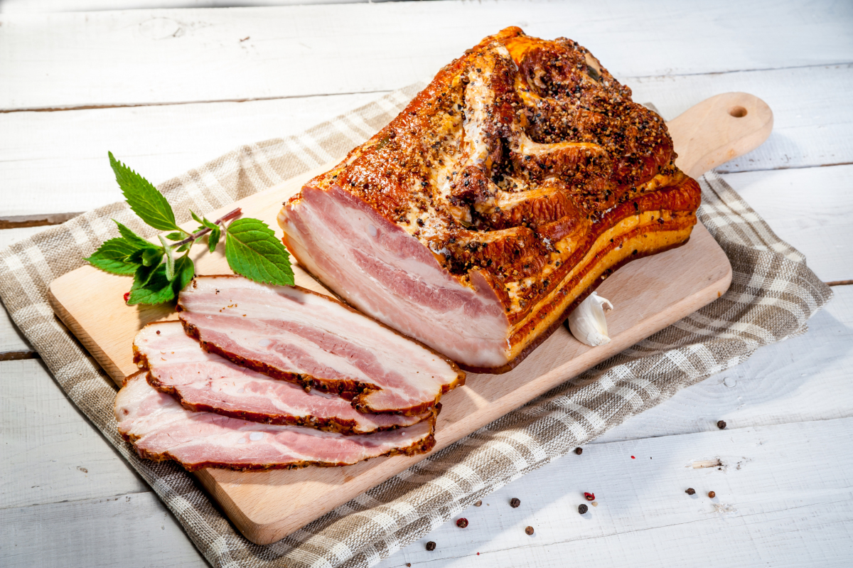 BOCZEK WIEPRZOWY, WĘDZONY, PARZONY. 100 G PRODUKTU WYPRODUKOWANO ZE 114,9 G BOCZKU WIEPRZOWEGO. SKŁADNIKI: BOCZEK WIEPRZOWY, SÓL, PRZYPRAWY (W TYM GORCZYCA), SUBSTANCJA KONSERWUJĄCA - AZOTYN SODU (SKŁADNIK SOLI PEKLUJĄCEJ). MOŻE ZAWIERAĆ: MLEKO ŁĄCZNIE Z LAKTOZĄ, JAJA, SELER, SOJĘ. WARTOŚĆ ODŻYWCZA PRODUKTU W 100 G: WARTOŚĆ ENERGETYCZNA 1318 KJ/ 318 KCAL, TŁUSZCZ 27 G, W TYM KWASY TŁUSZCZOWE NASYCONE 11 G, WĘGLOWODANY <0,5 G, W TYM CUKRY <0,5 G, BIAŁKO 19 G, SÓL 2,0 G. PAKOWANO W ATMOSFERZE OCHRONNEJ.BACON KURPIAN SPECIALTIESSMOKED, SCALDED PORK BACON. 100 G OF THE PRODUCT WAS PRODUCED FROM 114.9 G OF PORK BACON. INGREDIENTS: PORK BACON, SALT, SPICES (INCLUDING MUSTARD SEEDS), PRESERVATIVE - SODIUM NITRATE (PICKLING SALT INGREDIENT). MAY CONTAIN: MILK, INCLUDING LACTOSE, EGGS, CELERY, SOY. PRODUCT NUTRITIONAL VALUE PER 100 G: ENERGY 1318 KJ/318 KCAL, FATS 27 G, OF WHICH SATURATES 11 G, CARBOHYDRATES < 0.5 G, OF WHICH SUGARS < 0.5 G, PROTEIN 19 G, SALT 2.0 G. PACKED IN PROTECTIVE ATMOSPHERE.