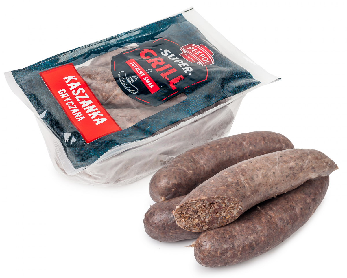 WĘDLINA PODROBOWA. KISZKA WIEPRZOWA PARZONA.SKŁADNIKI: KASZA GRYCZANA - 20,9%, WODA, PŁUCA WIEPRZOWE, MIĘSO Z GŁÓW WIEPRZOWYCH – 11,6%, SKÓRKI WIEPRZOWE, WĄTROBA WIEPRZOWA - 2,8%, TŁUSZCZ WIEPRZOWY, HEMOGLOBINA WIEPRZOWA, SÓL, PRZYPRAWY (W TYM GORCZYCA), EKSTRAKTY PRZYPRAW, AROMATY, WARZYWA SUSZONE ( W TYM SELER), REGULATORY KWASOWOŚCI: E261, E326, CUKIER, GLUKOZA, HYDROLIZAT BIAŁKA ROŚLINNEGO (RZEPAKOWO- KUKURYDZIANY). OSŁONKA JADALNA – JELITO WIEPRZOWE.MOŻE ZAWIERAĆ: MLEKO ŁĄCZNIE Z LAKTOZĄ, GLUTEN, SOJA, JAJA.WARTOŚĆ ODŻYWCZA PRODUKTU W 100 G: WARTOŚĆ ENERGETYCZNA 645 KJ/ 154 KCAL, TŁUSZCZ 7,5 G, W TYM KWASY TŁUSZCZOWE NASYCONE 3,1 G, WĘGLOWODANY 12 G, W TYM CUKRY 1,6 G, BIAŁKO 9,0 G, SÓL 1,0 G.PAKOWANO W ATMOSFERZE OCHRONNEJ.BUCKWHEAT PUDDINGOFFAL SAUSAGE. STEAMED PORK INTESTINE.INGREDIENTS: BUCKWHEAT - 20.9%, WATER, PORK LUNGS, MEAT FROM PORK HEADS- 11,6 %, PORK SKINS, PORK LIVER- 2,8 %, PORK FAT, PORK HEMOGLOBIN, SALT, SPICES (INCLUDING MUSTARD), EXTRACTS OF SPICES, FLAVORS, DRIED VEGETABLES (INCLUDING CELERY), ACIDITY REGULATORS: E261, E326, SUGAR, GLUCOSE, VEGETABLE PROTEIN HYDROLYZATE (RAPE-CORN). IN EDIBLE CASING-PORK INTESTINE.MAY CONTAIN: MILK INCLUDING LACTOSE, GLUTEN, SOY, EGGS.NUTRITIONAL VALUES OF 100G PRODUCT: ENERGY VALUE 645 KJ/ 154 KCAL, FAT 7,5 G OF WHICH SATURATES 3,1 G, CARBOHYDRATE 12 G, WHICH SUGARS 1,6 G, PROTEIN 9,0 G, SALT 1,0 G.PACKED IN PROTECTIVE ATMOSPHERE.