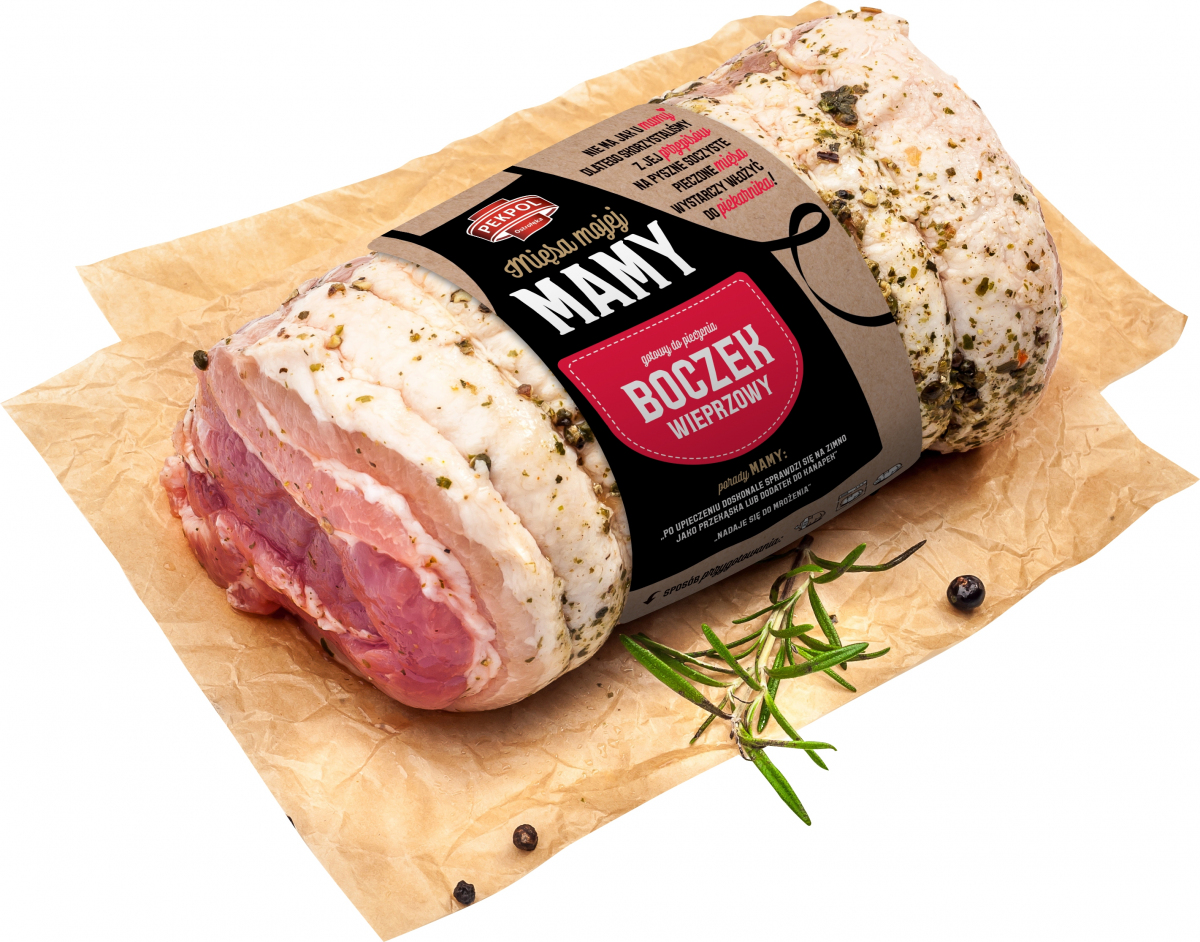 SUROWY WYRÓB MIĘSNY, Z DODATKIEM WODY.SKŁADNIKI: BOCZEK WIEPRZOWY - 87%, WODA, SÓL, MALTODEKSTRYNA, GLUKOZA, AROMATY, BIAŁKO WIEPRZOWE, SUBSTANCJA ZAGĘSZCZAJĄCA E407, STABILIZATOR E331, REGULATORY KWASOWOŚCI: E261, E326; PRZYPRAWY, EKSTRAKTY PRZYPRAW.MOŻE ZAWIERAĆ: MLEKO ŁĄCZNIE Z LAKTOZĄ, GORCZYCĘ, JAJA, SELER, SOJĘ.SUROWY WYRÓB MIĘSNY, GOTOWY DO SPOŻYCIA PO OBRÓBCE CIEPLNEJ.WARTOŚĆ ODŻYWCZA PRODUKTU W 100 G: WARTOŚĆ ENERGETYCZNA 1087 KJ/ 262 KCAL, TŁUSZCZ 22 G, W TYM KWASY TŁUSZCZOWE NASYCONE 8,3 G, WĘGLOWODANY 1,3 G, W TYM CUKRY <0,5 G, BIAŁKO 15 G, SÓL 1,1 G.PAKOWANO PRÓŻNIOWO.