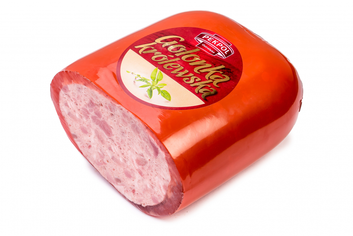 PRODUKT WIEPRZOWY, BLOKOWY, PARZONY. STUDZIENINA, W OSŁONCE NIEJADALNEJ.SKŁADNIKI: MIĘSO WIEPRZOWE - 62,5%, WODA, SÓL, ŻELATYNA WIEPRZOWA, SKROBIA MODYFIKOWANA, SUBSTANCJE ZAGĘSZCZAJĄCE: E407, E415, E425; STABILIZATORY: E450, E451, E508, E262, E330, E331; MALTODEKSTRYNA, GLUKOZA, BIAŁKO SOJOWE, AROMAT (ZAWIERA MLEKO, ŁĄCZNIE Z LAKTOZĄ), WZMACNIACZ SMAKU E621, EKSTRAKT DROŻDŻOWY, PRZYPRAWY I EKSTRAKTY PRZYPRAW (ZAWIERAJĄ SELER), REGULATOR KWASOWOŚCI E334, PRZECIWUTLENIACZ E316, SUBSTANCJA KONSERWUJĄCA E250.MOŻE ZAWIERAĆ: GLUTEN, GORCZYCĘ, JAJA.WARTOŚĆ ODŻYWCZA PRODUKTU W 100 G: WARTOŚĆ ENERGETYCZNA 515 KJ/ 123 KCAL, TŁUSZCZ 5,5 G, W TYM KWASY TŁUSZCZOWE NASYCONE 1,7 G, WĘGLOWODANY 2,9 G, W TYM CUKRY 0,7 G, BIAŁKO 15 G, SÓL 1,8 G.ROYAL KNUCKLEPORK BLOCK PRODUCT, ASPIC, IN INEDIBLE CASING.INGREDIENTS: PORK MEAT - 62.5%, WATER, SALT, PORK GELATINE, MODIFIED STARCH, THICKENERS: E407, E415, E425; STABILIZERS: E450, E451, E508, E262, E330, E331; MALTODEXTRINE, GLUCOSE, SOY PROTEIN, AROMA (INCLUDES MILK WITH LACTOSE), FLAVOUR ENHANCER E621, YEAST EXTRACT, SPICES AND EXTRACTS OF SPICES (INCLUDING CELERY), ACIDITY REGULATOR E334, ANTIDIOXIDANT E316, PRESERVATIVE E250.MAY CONTAIN: GLUTEN, MUSTARD, EGG.NUTRITION FACTS PER 100 G: ENERGY VALUES 515 KJ/123 KCAL TOTAL FAT 5,5 G SATURATED FAT 1,7 G TOTAL CARBOHYDRATE 2,9 G SUGARS 0,7 G PROTEIN 15G SALT 1,8 G.