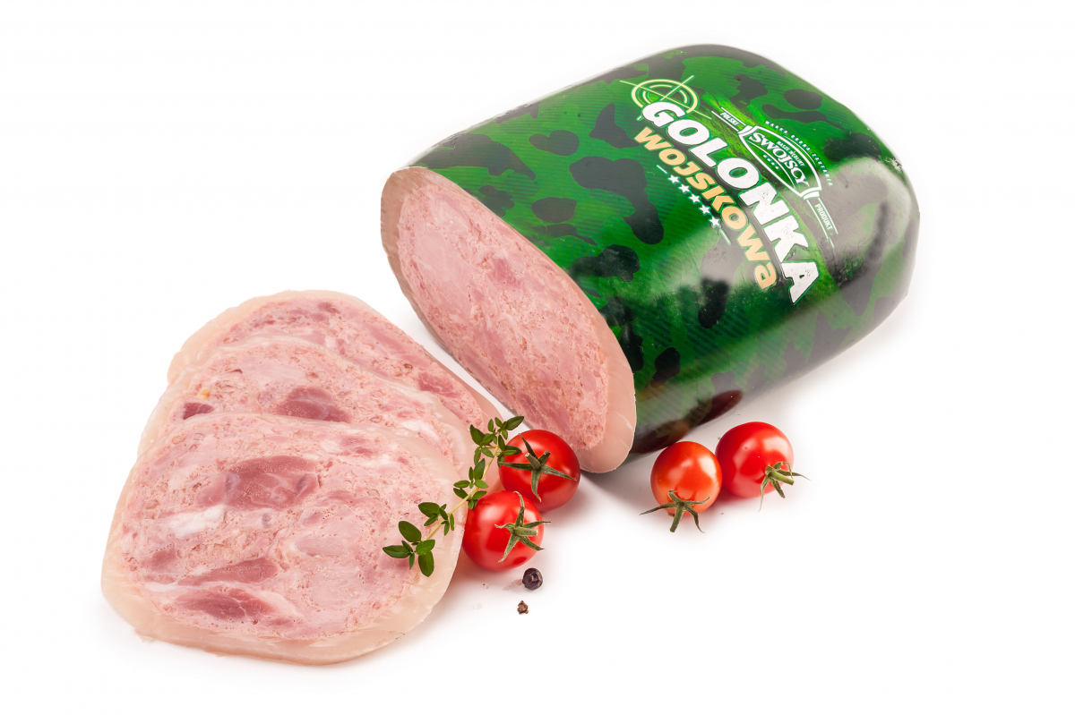 PRODUKT WIEPRZOWY, BLOKOWY, PARZONY. STUDZIENINA, W OSŁONCE NIEJADALNEJ.SKŁADNIKI: MIĘSO WIEPRZOWE - 62,5%, WODA, SÓL, ŻELATYNA WIEPRZOWA, SKROBIA MODYFIKOWANA, SUBSTANCJE ZAGĘSZCZAJĄCE: E407, E415, E425; STABILIZATORY: E450, E451, E508, E262, E330, E331; MALTODEKSTRYNA, GLUKOZA, BIAŁKO SOJOWE, AROMAT (ZAWIERA MLEKO, ŁĄCZNIE Z LAKTOZĄ), WZMACNIACZ SMAKU E621, EKSTRAKT DROŻDŻOWY, PRZYPRAWY I EKSTRAKTY PRZYPRAW (ZAWIERAJĄ SELER), REGULATOR KWASOWOŚCI E334, PRZECIWUTLENIACZ E316, SUBSTANCJA KONSERWUJĄCA E250.MOŻE ZAWIERAĆ: GLUTEN, GORCZYCĘ, JAJA.WARTOŚĆ ODŻYWCZA PRODUKTU W 100 G: WARTOŚĆ ENERGETYCZNA 515 KJ/ 123 KCAL, TŁUSZCZ 5,5 G, W TYM KWASY TŁUSZCZOWE NASYCONE 1,7 G, WĘGLOWODANY 2,9 G, W TYM CUKRY 0,7 G, BIAŁKO 15 G, SÓL 1,8 G.